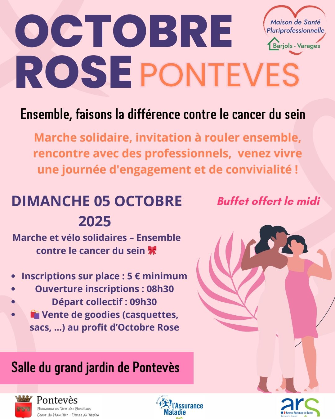 Cette année, la Maison Médicale Varages-Barjols organisait une journée dans le cadre d'Octobre Rose, Tous mobilisés contre le cancer du Sein sur la commune de Pontevès, salle du Grand Jardin (sous la Mairie). Cette journée a eu lieu le dimanche 05 octobre 2025. 1 randonnée pédestre, 2 randonnées VTT, 3 randonnées cyclotourismes et Gravel. Des intervenants médicaux étaient présents pour parler de la lutte contre le cancer du sein, mais également pour la prévention.